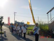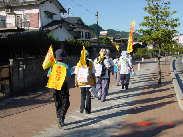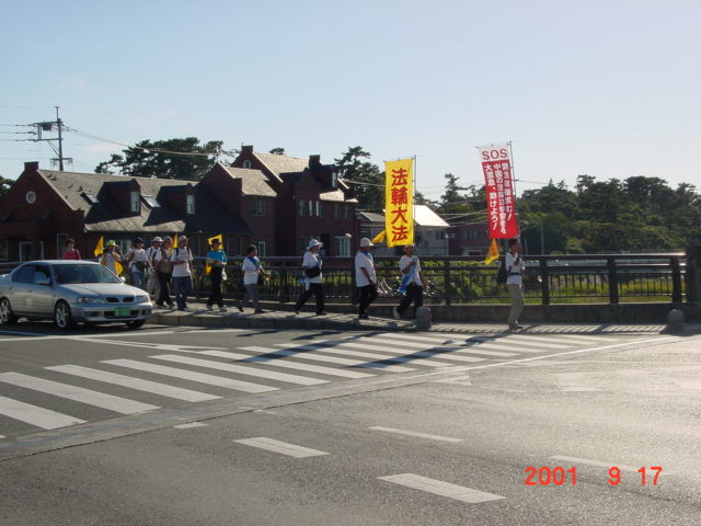 在人稍多的村镇,大家就集体炼功,发报纸,并向人们讲清真相。走到一些公共设施,大家也都去发放资料,也尽可能多地去沿途的政府行政部门如町役场等,带上资料,图片去洪法讲真相。所去的役场的接待人员几乎都能很耐心地倾听,了解真相,并答应将真相报纸张贴在公告栏,有的还以个人名义签了名。遇到几十公里内没有村落的路段,休息时大家就在路边挂起横幅,炼功,发正念。过往行驶的车辆都向我们注目,大家都希望有更多的人来了解大法和迫害真相。一起行走的有一位年近六十的老学员,路上许多人看到她身披的徒步日本的彩带,都不敢相信,许多人都走上前来,主动询问情况,于是大家就借此机会向他们洪法,效果非常好。