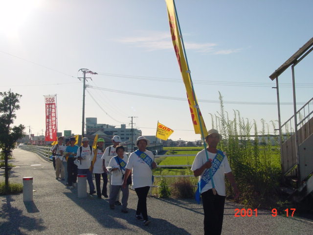 | 2001年9月14日星期日,齐发正念 | 2001年9月16日,步行第五天,更多的学员加入了步行队伍 |