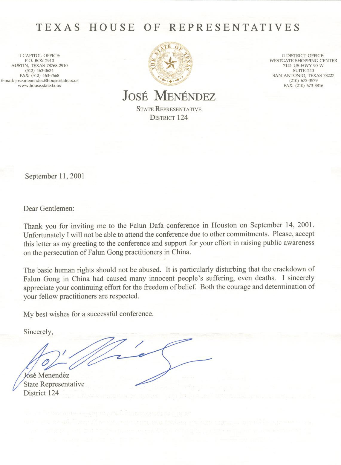 谢谢你邀请我参加在休斯顿举行的2001年法轮大法法会。虽然我本人因有约在身不能参加法会,但是请将此信作为我对这次大会的祝愿,并支持你们向广大人民讲清法轮大法修炼者在中国深受迫害的真相的努力。