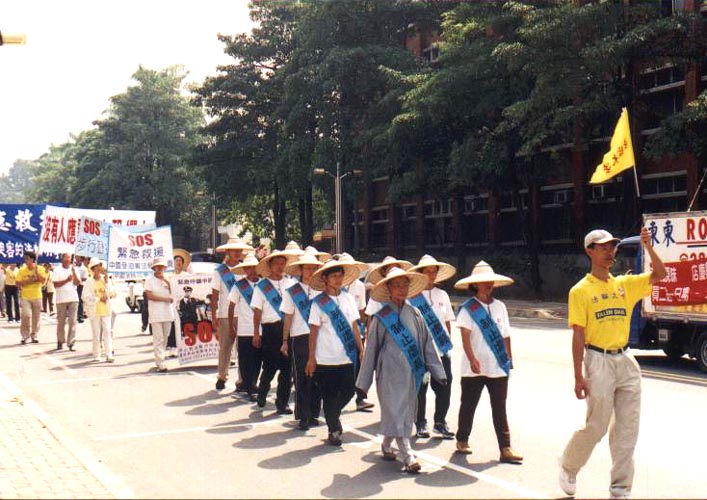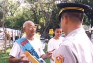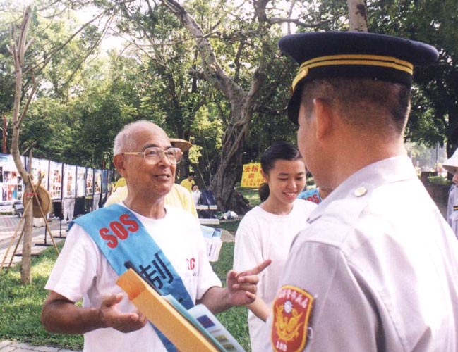 八十一岁的老先生何超,中气有力,不输年轻人;只差他一岁来自宜兰的郑文煌与他的贤内助何来琴女士,夫妻共修其乐融融;而年逾七十的国夫,欣喜地穿上一双新鞋踏上全台步行之际才发现鞋会打磨脚,虽然脚底磨出水泡,他仍然无怨无悔无退心的一步步走完全程,当抵达高雄时,脚也好了,鞋也顺当了。还有数位老阿嬷、老先生,他们一致说:“如果大家都来学法轮功,整个世界就和平了,学法轮功的保证是好人,是人间真正的净土。”