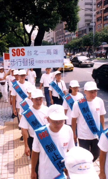 最后一天的步行,学员们越走越轻快。再加上高屏地区自动自发前来陪走的学员非常踊跃,他们都身穿法轮大法「真、善、忍」的黄色T恤,人手一只「SOS紧急救援」的小旗,再加上「制止虐杀」「谴责暴力」「SOS全球步行」等醒目的横幅,非常壮观醒目。步行队伍一面走,一面播放大法普度济世音乐,前后左右并有不少学员散发说明中共暴力迫害法轮功的简介,如此平和的讲清真相方式,自然散发一股大法正义,慈悲的影响力。