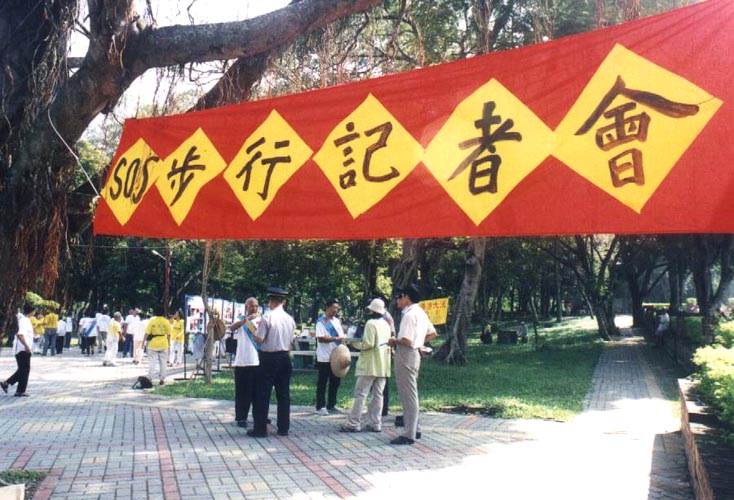 这廿五位法轮大法弟子,十八位是从台北往南走,一个县市一个乡镇的走到高雄,另外七位是从宜兰出发,经花东到达高雄。从九月十一日开始全台东西两岸的步行,历经十四天的艰苦考验,两路人马廿四日中午十二时在高雄市会合,再一起走向「步行圆满记者会」的会场----高雄市中正文化中心。