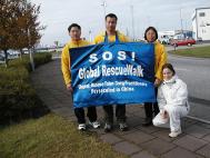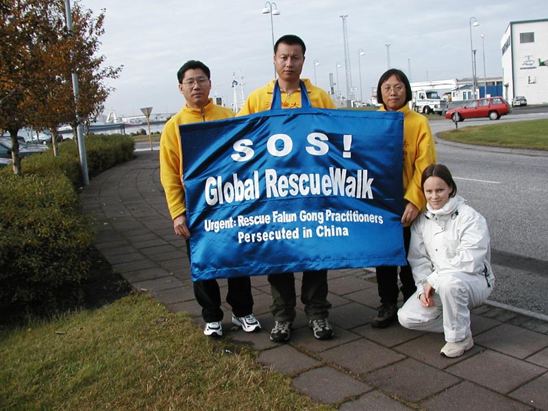 从临近的Hafnarfjordur市步行至首都Reykjavik市,距离约10公里。虽然距离不长,却有冰岛的四家媒体来照相,摄影和采访。其中有当地的电视台,晚报,无线电台,还有一家杂志社。步行中,不时有过路的行人和司机向我们频频示意,以示鼓励。在这个名字都带有寒意的偏远岛国里,大家仍能强烈地感到势不可挡的正法进程。