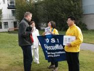 上午出发前,三名华人学员去中国驻冰岛大使馆递交步行法轮功学员致大使及使馆工作人员的一封信。在面对面的交谈中,学员们强烈感受到使馆工作人员迫于江泽民政治流氓集团的巨大压力,而不敢亲自接纳我们的信件。最后我们用传真的方式传给了使馆。同时在我们讲清真相的过程中,我们仍能感受到他们依稀尚存的一点良心。由衷地希望这次交谈能帮助他们多了解一点中国法轮功学员受迫害的真实情况,从而不再与邪恶为伍,能在这一亘古未遇的历史时刻摆放好自己的位置。