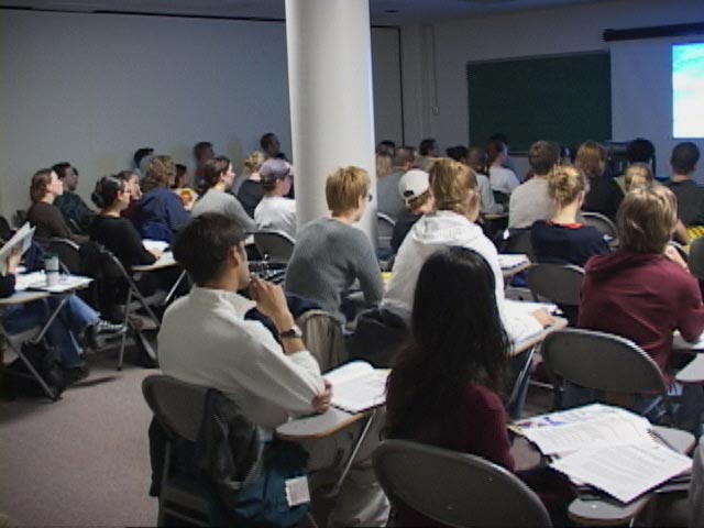 原来,应卡尔顿大学法律系教授威士力先生邀请、在社会科学教授凯伦女士协助下,四名法轮功学员正在给90余名法律系学生上着一堂特殊的课:法轮功与人权迫害。学生们对令人发指的迫害所震惊。