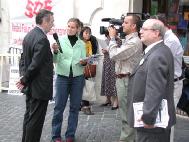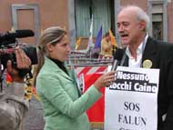 12:30分,记者招待会在议会广场召开,前欧盟委员会主席,现任欧盟议员埃玛女士,意大利议会副议长比昂迪,议会外交委员会主席古斯塔夫,参议员达米克,议会永久委员会(司法部)代表和NTC协会主席纷纷发言,赞扬法轮功修炼者的祥和和宁静,称“真善忍”是人类共同的价值,表示支持法轮功学员的合法权利,并敦促中国政府停止迫害法轮功。法轮功代表也介绍了当前江氏集团利用恐怖主义政策加剧迫害大法弟子的情况。两位在大陆受到迫害的艺术家介绍了他们的经历。特别值得一提的是,副议长本来在议会中主持会议不能参加发布会,他给发布会写来了他要发布的信息,已由主持人代为宣布。但他还是在最后一刻,本人及时赶到并作了精彩演讲。