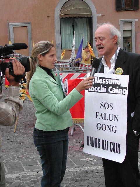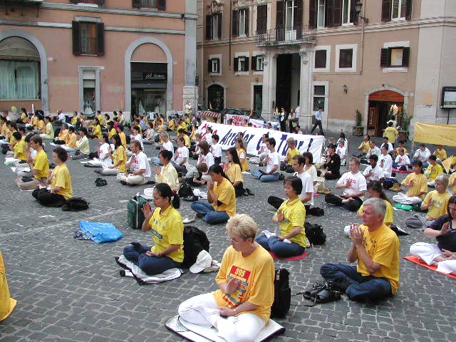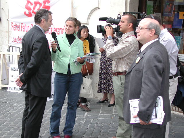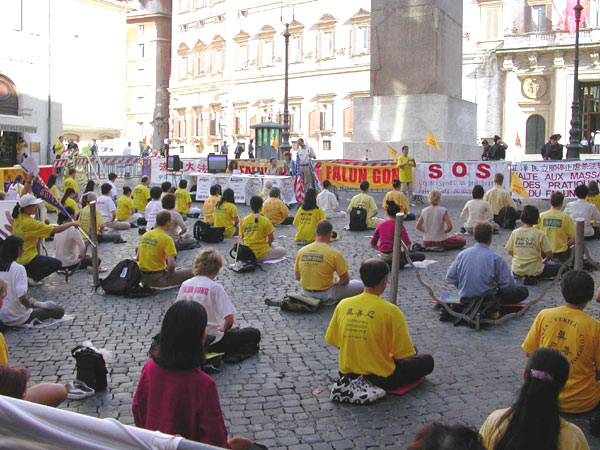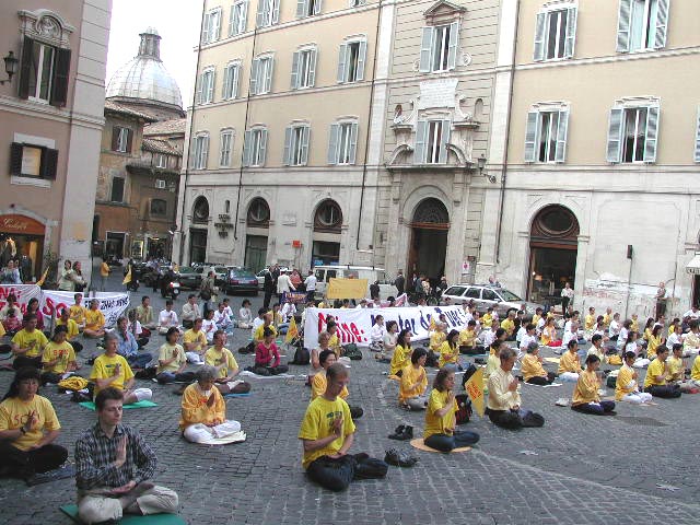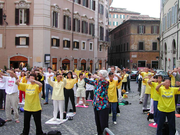 早上9:00,下过一夜暴雨的罗马,天空非常晴朗,气温温和。200多名大法弟子来到议会广场,随着炼功音乐连续演示5套功法,并多次齐发正念,祥和的气氛和优美的动作,引起了在议会门前执勤的警察,和过路的行人和来上班的议员们的好奇和关注。由于在纽约发生的恐怖主义事件,许多媒体都曾表示对我们的活动没有兴趣,不准备来采访。大约十点钟左右,我们却看到各主要电视台,新闻社和报纸记者都纷纷到场,对学员的炼功场面进行长时间拍摄,并对在场学员进行采访。