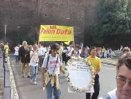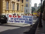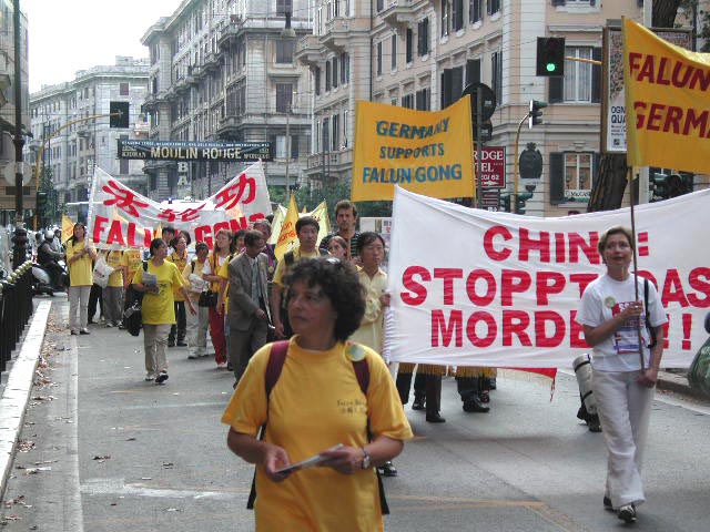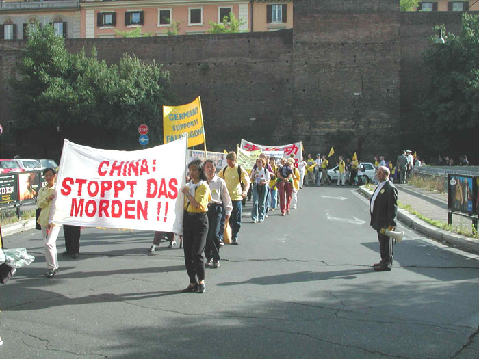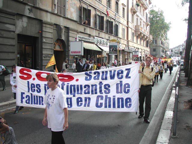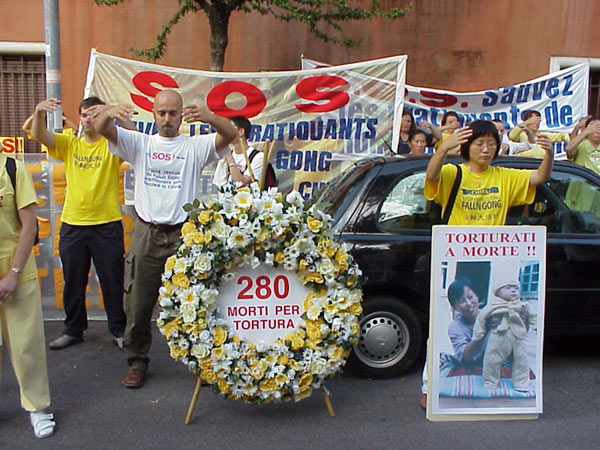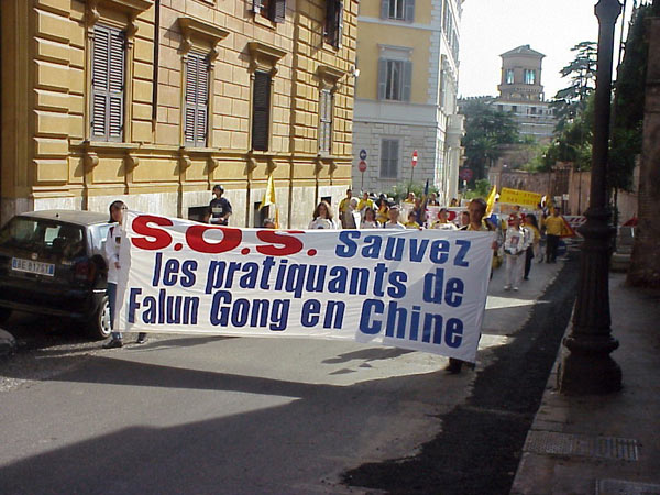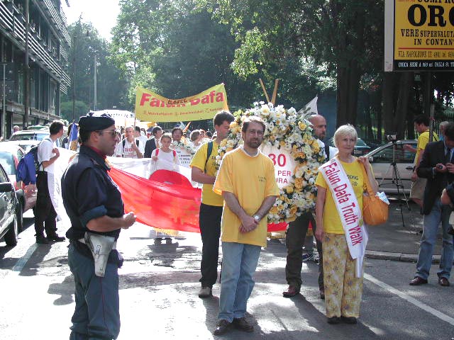 下午3点,游行队伍从著名的西班牙广场出发。走在队伍最前面的是欧盟议员帕内拉,还有许多NTC成员和激进党成员和其它协会的成员参加了游行。大法弟子抬着花圈,举着横幅,在“普度”“济世”的音乐下,穿过市区向中国大使馆进发。整个队伍庄严肃穆,行人和居民纷纷驻足观看,许多弟子在队伍两边散发真相资料。在警察的保护下,长长的队伍来到中国大使馆门前。大家首先齐发正念,意大利大法弟子代表念了致中国大使的请愿信,随后由帕内拉议员递交请愿信并要求会见中国官员。可惜大门始终紧闭,里面只有一个意大利女士,回答说她接到命令,不可以接信和开门。甚至当议员先生说:“我只是罗马的一个邮差,是否可以接我的信”时,收到的还是否定的答复。最后,在记者,警察和众人面前,议员将信放进了大使馆的信箱里。