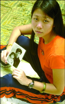 图片:建筑工程系2年级学生王丹手持一张她父亲的照片。她父亲因修炼法轮大法而从1999年起被中国当局监禁。法轮功于1999年7月20日被中国主席江XX取缔。德克萨斯日报2001年9月5日刊登文章,报导一名德州大学学生的父亲在中国因炼法轮功被判刑16年。