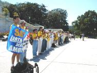过往的游人驻足观望,接过资料,仔细地阅读。健身运动的人们放慢了脚步,与学员交谈。“你们真棒,希望你们坚持,继续努力,你们的声音已经被世人听到。会有越来越多人知道真相,你们是为了希望而奋斗的人,祝你们好运”...“祝你们好运”,“祝你们好运”...每一声真诚的祝福就代表着一个正义的声音。