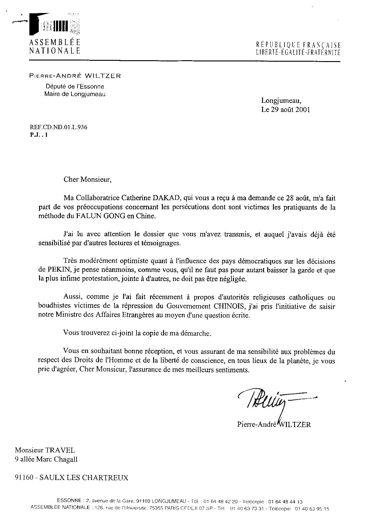八月二十八日应我要求接待您的我的合作人卡特林娜·达卡向我讲述了您对于以在中国的法轮功修炼者为受害者的镇压的关注。