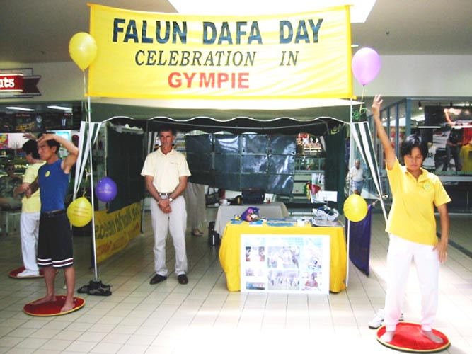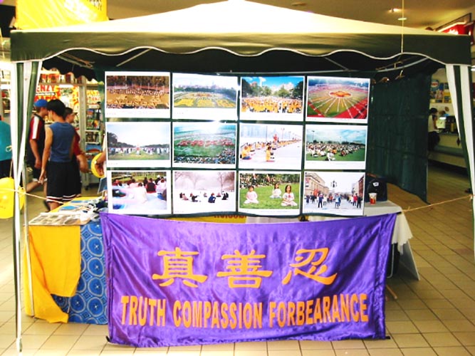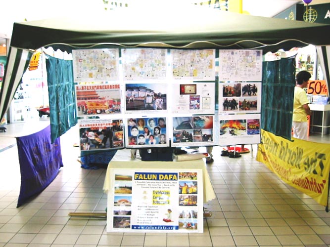我们很顺利地完成了金矿广场(Goldfield Plaza)的布置工作,我们的展位包括“法轮大法之路”图片展、横幅、传单桌、法轮功书籍和海报。