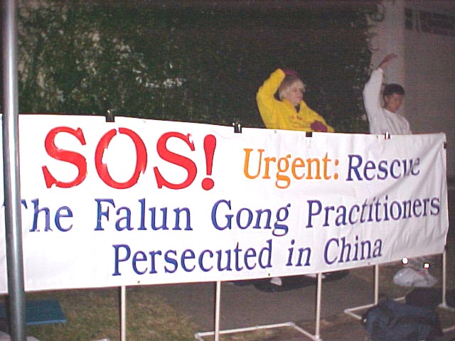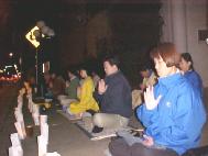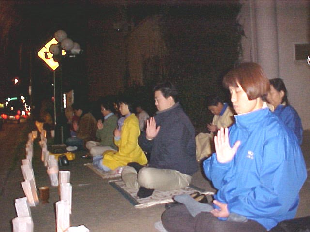 傍晚七时整,大法弟子在中领馆前举行烛光悼念。中领馆前摆放了各种大横幅,写着”中国停止虐杀法轮功学员”和”紧急救援中国法轮功学员”。烛光闪闪,血泪的控诉;大法弟子不断地发正念,清除邪恶,清除三界内的一切邪恶。