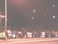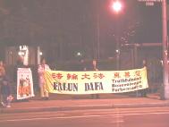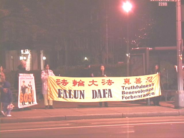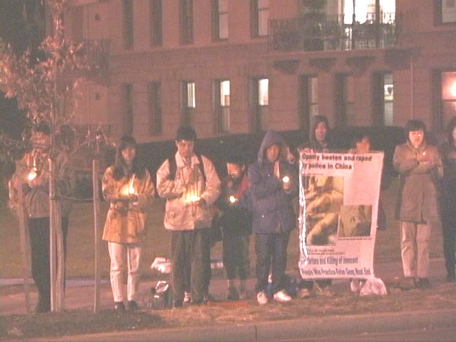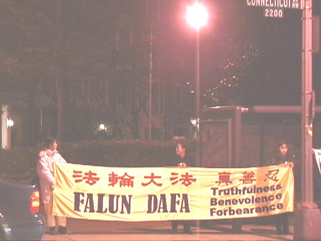 晚上5:30~7:00,大华府60余名弟子在使馆前的康涅迪格大道两侧整齐地排开,手持小蜡烛,展开大横幅,举行了烛光守夜活动。马路上汽车川流不息,驶近学员们的汽车纷纷摇下车窗接过真相资料,有些常经此处的人们则是早已熟悉了大法弟子的身影,或伸出大拇指,或友好地问候我们。