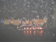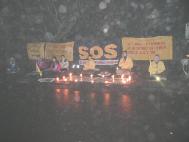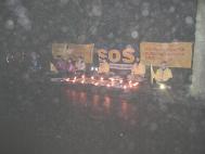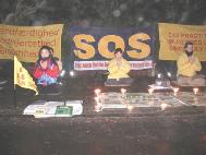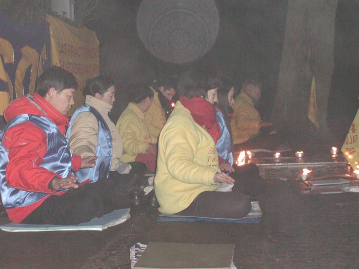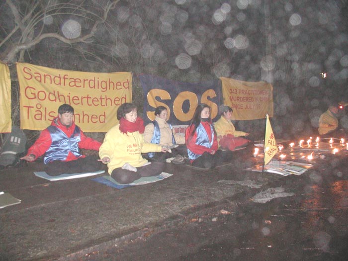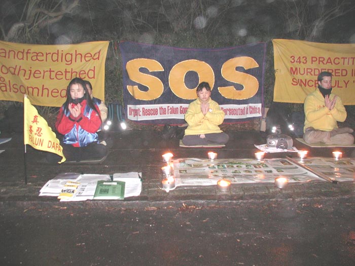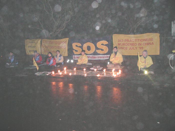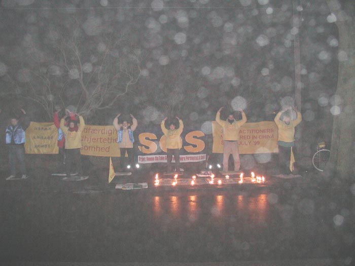 晚七时,我们在中国大使馆前开始了两小时的烛光守夜活动。地处北欧的丹麦,正经历过一场多年不遇的大雪,至今积雪尚未融尽。为了制止虐杀,救援正在遭受迫害的中国同修,大家不顾严寒的天气,用强大的正念清除邪恶。在发正念的间隙期间,以炼功的方式表达抗议和谴责。