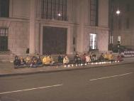 在我们聚集的地方有个红绿灯。当红灯亮时车子都停了下来,人们纷纷打开车窗伸手索要大法资料。发资料的弟子们常常要一溜小跑才能赶在变灯之前把资料发到每辆车中。还有的人鸣笛向我们表示同情与支持。有个骑摩托车的人特意把车停在路边走过来在请愿书上签字。还有一个行人对一个弟子说,“我不太了解法轮功,但是你们无论做什么我都支持你们。”许多善良的人向我们说,“祝你们好运!”