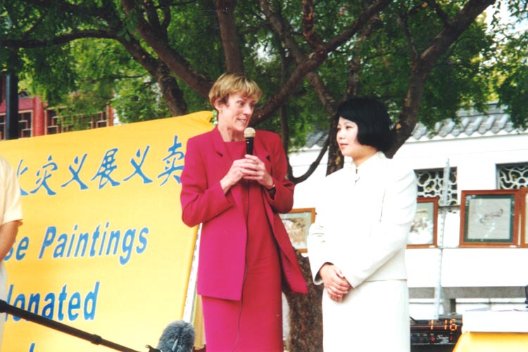 我在世界20多个国家巡回画展,受到了各国政府官员和媒体的帮助。在爱尔兰,市长腾出自己的办公室让我办画展;在日本,议员帮我买机票、租场地,拿出50万日圆,以让我能在日本6个城市进行画展;在英国、加拿大政府议员让我在国会大厦办画展;德国的艺术文化局局长给我们三层楼的楼房免费让我办画展……,想不到,在澳洲为山火灾民捐钱重建家园,举办义展,还要受到XX政府的阻挠,对于这种不公正的待遇,我们所有的善良人们都要起来共同制止。在二十一世纪的今天,这种事情是不应该发生的,这一切的发生,也就是因为我炼法轮功。大家知道,4年前,我因为患严重关节炎,吃饭、走路都困难,失去作画的能力,当我学了法轮功以后,我身体神奇地很快恢复了健康,是法轮大法给了我第二次的艺术生涯。然而,1999年7月,中国江泽民政府开始对法轮功进行镇压,我回到中国北京为法轮功说句公道话,我只说了一句‘法轮功好’,他们就把我关了4个监狱长达8个月,让我过着生不如死、地狱般的牢役生活。狱警的毒打,使我遍体鳞伤,并给我戴上沉重的脚镣。当我仍然坚信真善忍时,他们就把我扔进男区监狱,进行人格的羞辱。一天十几小时的奴役般的监狱苦工,一周七天,不停地干活,还唆使犯人打我,打了我,就给减刑;并让我睡在冰冷的水泥地上,头朝着厕所;吃饭则是从别人的碗里拨一点给我吃,不给我水喝……,每当各国政府官员听了我的亲身遭遇后,纷纷谴责说:‘这样的人权迫害的政府太糟糕,应该把江泽民送上国际法庭!’包括很多市长纷纷来信,要严励惩罚这样的人权迫害狂!因为我是澳洲公民,才得以在澳洲政府的营救下,使我能活着从中国监狱里出来,而中国大陆千千万万的法轮功学员,却没有这样的机会,他们甚至被活活害死在监狱里。现在的中国法轮功学员,他们的生命每分钟都受到威胁。我们呼吁全世界善良的人们,帮助我们共同制止这场邪恶的迫害,世界需要真、善、忍,生命需要真、善、忍,人人需要真、善、忍,尤其今天的社会需要真、善、忍,,让我们共同维护人权,把江泽民送上国际法庭!制止邪恶!”