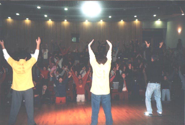 几周前一个星期五中午时几位学员来到学校。礼堂的负责人帮助我们准备作大法介绍的设备。学员们打算放映几个VCD影片。由于礼堂没有放VCD光盘的设备,学员自己从家里带来放映机。开始负责人不同意使用学员的放映机,说接线太复杂了。无论学员怎样解释只接两根线就可以了,这位负责人还是不同意。另一位学员提议在讲话的时候发正念。当学员刚一开始发正念时,这位负责人马上就同意了,好像从来都没想过要拒绝一样。大家又一次体会到了正念的威力。