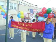 庆祝活动由游行开始。近20名举着“法轮大法”和“真善忍”横幅以及法轮功宣传画的法轮功学员频频向街道两边的市民招手致意,共祝新年快乐,街道两边的市民对冒着寒冷参加庆祝活动的法轮功学员报以掌声。游行队伍最后来到迪乃克市社区活动中心大厅参加开幕式。法轮功学员整齐地坐在主席台一侧的最高一级看台上,并将“法轮大法”和“真善忍”的横幅高高举起,使得全场的观众和来宾一眼就可以看到。