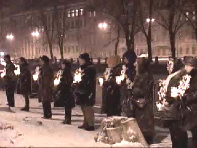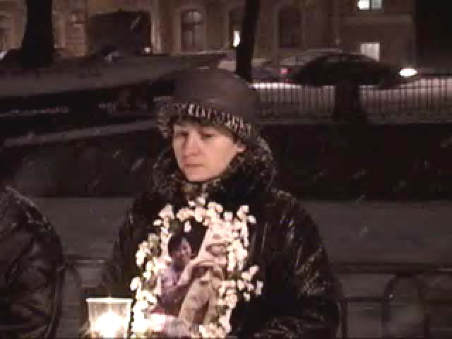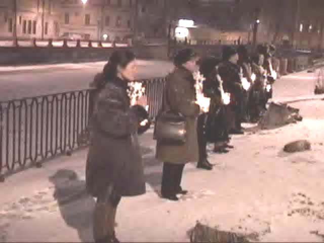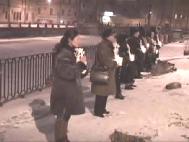 尽管是阴雨天,12名学员仍然整齐地在中领馆门前站成一排,手持鲜花环绕的被江泽民集团残酷迫害致死的同修们的遗照和点燃的蜡烛,以示抗议。抗议期间,一位学员走出队列,照例向中领馆转交呼吁中国当局停止对法轮功非法镇压的公开信,再次遭到了无理拒绝。
