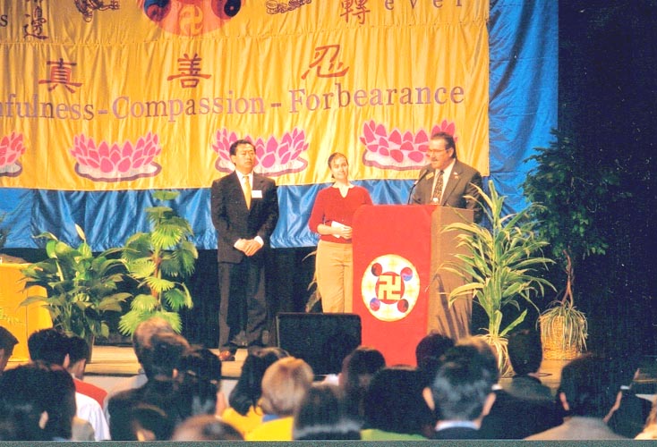 法轮功学员对于市政府的支持表示了感谢,并表示会尽力将真善忍带给所在城市的人民。詹姆斯.伯纳特先生颁发了两项褒奖--2001年12月29日至2002年1月4日为法轮大法周,及法会的两天2001年12月29日和30日为李洪志日。在褒奖状中詹姆斯.伯纳特先生特别赞扬了法轮功学员在反抗中国江泽民政府的邪恶镇压中所表现出的大善大忍。