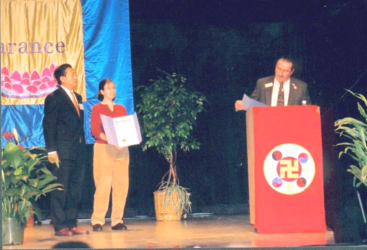 12月29日上午,佛州心得交流会正式开始。来自世界各地的600多位弟子参加了此盛会。在开幕词之后,詹姆斯.伯纳特先生上台亲自向法轮功颁发褒奖并发表了讲话,高度赞扬了法轮功所倡导的真善忍原则。他特别在讲话中用他年轻时如何通过忍让,以及让高年级学生也知道忍的道理而制止了在学校里盛行的对低年级学生的恶作剧恶习的亲身经历谈到了忍的重要性。他认为在现在这个不安定的社会环境下,这些原则是非常重要的。他说正是因为法轮功的真善忍原则而吸引了上亿的人修炼。在讲话中他指出是中国的江泽民独裁政府导致了对法轮功的迫害。他号召全市的人民都支持法轮功修炼者的努力。他并表示很遗憾这么重要的会议没能在圣彼德堡市召开并建议下一年的会议能在他所在的城市召开。