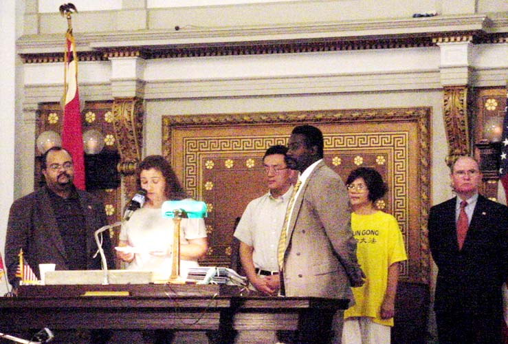 | 圣路易市议会决议 | 圣路易市议会宣读给予法轮功褒奖。后排右一为议会副主席史如斯巴里(Shrewsbury)先生,右三为瑞德先生,左一为摩利先生。 |