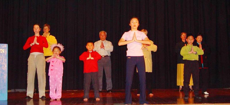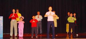 优美的音乐再次响起,看书的演员站了起来,走到舞台中间开始炼「佛展千手法」,然后老老少少的炼功人“俩俩相继而来”,加入了炼功的队伍(图二)。舒缓的音乐中整齐安详的动作让整个会场充满了祥和的气氛。