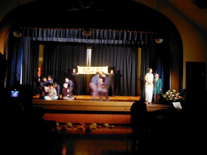 第五幕表现的是西人弟子到天安门证实大法。大幕拉开,投影屏幕上闪过一张又一张弟子们在天安门广场正法、被捕、被打的照片,最后,照片定格在了36名西人弟子手举“真善忍”横幅在天安门打坐和加拿大弟子泽农高举“法轮大法好”横幅在天安门发出那惊天动地的呐喊的场面,这时,幕后响起了小弟子纯净的声音:“带着最深的敬意,我踏上了你们的国土,为了你们而支持真理。我希望我这一副外族的面孔和纯净的心能够唤起你们心中依然存在的善良……”;诵读声中,一名去过天安门的西人弟子和一名中国弟子走到舞台的一角,开始了女声二重唱《为你而来》:“跨越千山万水,我一次又一次为你而来……”在她们演唱的同时,舞台中间天安门广场的布景之下,无声地上来了一个个弟子,他们有的打坐,有的抱轮、有的手举横幅;警察一次次上来强行将他们拖走、抬走……暴力无声地进行着,间或夹以学员被拖开时的高喊:“法轮大法好!全世界都知道!”而舞台的一角,演唱的弟子丝毫不为所动,继续如泣如诉地唱着:“面对暴力危险,我一次又一次为你而来……”有声与无声,暴力与和平,美好与丑恶的鲜明直观的对比和反差强烈地震撼着观众的心。而演唱的西人学员那字正腔圆的中文发音更象是在诠释着歌词:“可贵的中国人啊,你可知道全世界都说,法轮大法好啊,法轮大法好,切莫错过这万世机缘……” (图五)