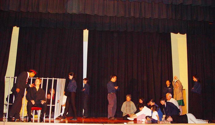 最后的一幕是《普天同庆》,监狱中的弟子脱下囚衣(图六),高唱着《法轮大法好》走出牢笼,所有参加演出的学员都走上台来加入演唱,连警察都扯掉警服上的警号,与学员一起唱了起来。台下的观众也加入进来,“法轮大法好”的歌声响彻整个会场,将歌舞剧推向了高潮。