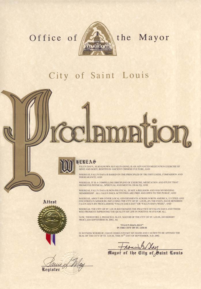 鉴于,圣路易市赏识法轮大法的功法以及那些提倡通过正确的方式让大家提高生活质量的人们;