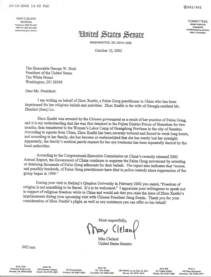 我代表周雪菲向您呈上此函。周雪菲是法轮功学员,乔治亚州居民吕朝晖先生的妻子,因为她的宗教信仰和活动在中国遭到[江氏集团的]监禁。