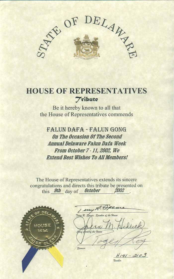 众议院致以真挚的祝贺,并于2002年10月9日颁布此褒奖。