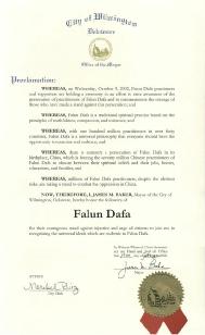 尽管明知危险,数百万法轮大法学员仍坚持抗争中国(江氏集团)的镇压。鉴此,我,詹姆士-贝克(James M.Baker),特拉华州威明顿市(Wilmington)市长,在此表彰法轮大法修炼者。