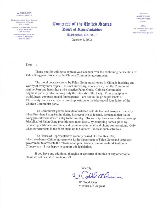 最近,众议院通过了188号决议,谴责中国[江氏]政府对法轮功学员的迫害,并敦促我们的政府要求释放所有被非法关押的法轮功学员。我非常高兴能支持这一决议。