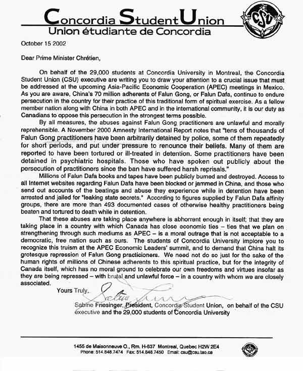 协和大学学生会执行委员会代表蒙特利尔协和大学(Concordia University)的两万九千名学生,向阁下呈上此函,以提请阁下关注一个极其严重的问题。该问题必须在即将在墨西哥召开的亚太经济合作会议(APEC)上作讨论。诚如阁下所知,在中国的七千万法轮功也称法轮大法的学员们因为信奉这一传统的修炼功法而不断在该国遭受迫害。作为中国在亚太经济合作和国际社会中的伙伴成员国,我们加拿大人有责任以最强烈的措辞反对这一迫害。