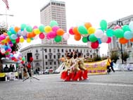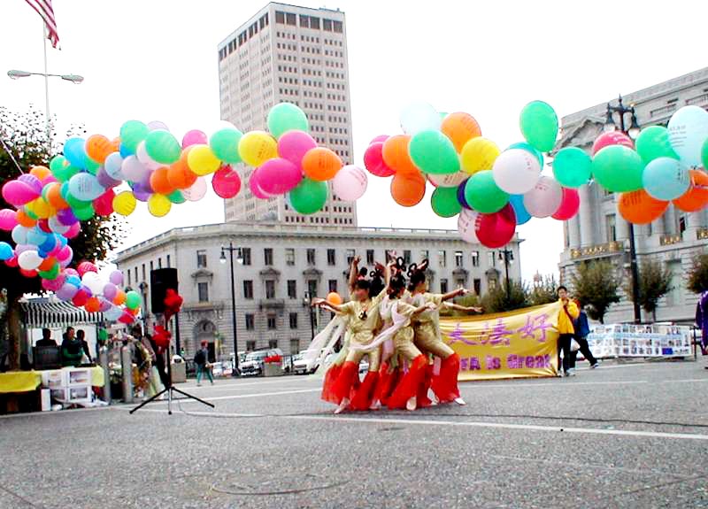接下来,二十位学员表演了法轮功的功法。而富有艺术天才的学员,以传统的中国歌舞表演,弘扬中华文化,吸引了众多的群众观赏。