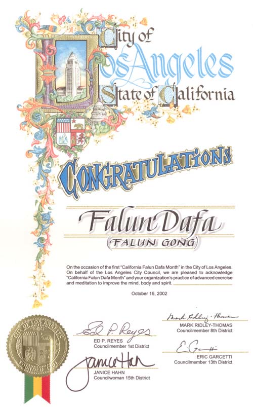 加州洛杉矶市议员祝贺首届“加州法轮大法月”