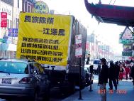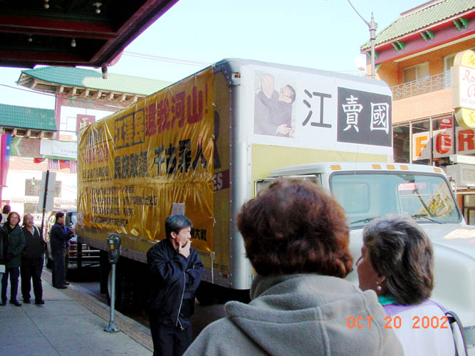 在江XX从酒店后门进入酒店后,一辆箱形卡车出现在酒店及附近,缓缓行驶,为迎江队伍带来一片寂静。车头上方写着大型“江卖国”字样并配有一张江搂抱叶利钦的图片。车身四周张挂着大型黄色布幅,上面用红黑兰三色大字写着“江泽民,还我河山!民族败类,千古罪人”“344万平方公里国土正式纳入俄国版图”“千古罪人,罪责难逃!”等字样。据一位芝城居民介绍,这辆箱形卡车自10月19日起,便开始在中国城来回行驶。