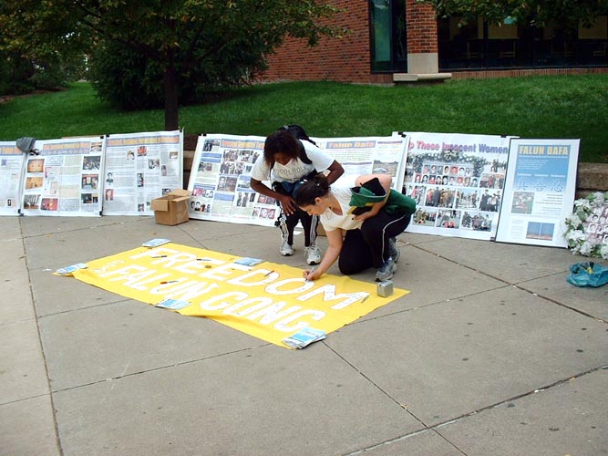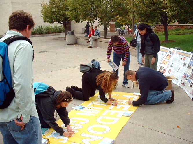 展板上贴有法轮功学员被酷刑折磨的真实照片。许多过往行人看到了照片不由地放慢了脚步。当他们知道这是为支持被迫害的法轮功学员而征集签名时,都毫不犹豫地在上面签上了自己的名字。短短两个小时就征集了几百个签名。