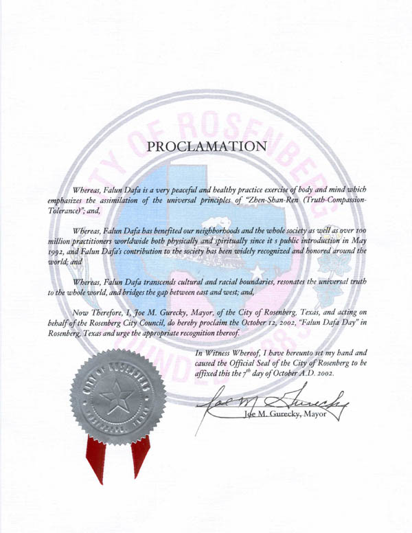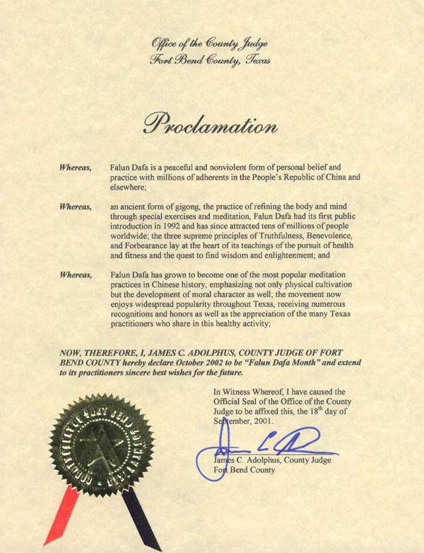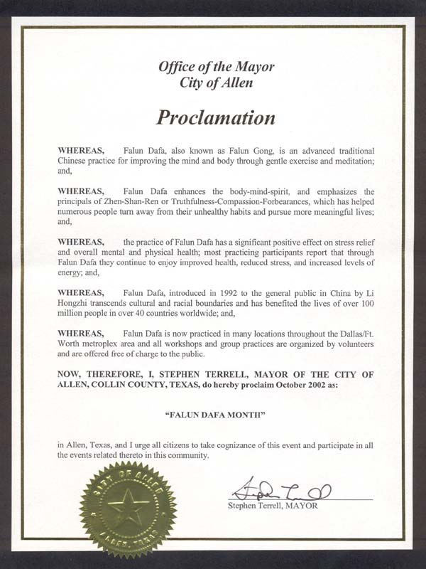 鉴于,法轮大法已经成长为中国历史上最受欢迎的修炼功法,她不仅强调修身,而且强调修心,发展道德品格;现在该功法在德克萨斯州广泛传播,收到无数的褒奖和荣誉,而且许多的德克萨斯修炼者都对这一健康活动表示感激;