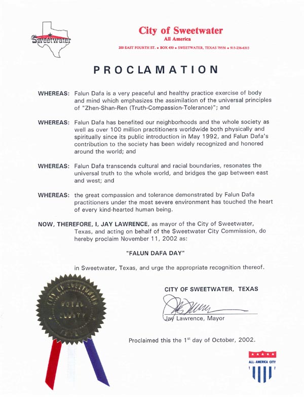 因此现在,决议,我,格兰德.那沃萨德,依靠授予我作为德克萨斯州瓦顿市市长的权力特此宣布2002年10月为“法轮大法认知月”并且衷心祝愿法轮大法修炼者一个美好的未来。