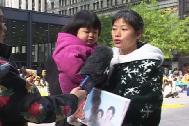 一名三四十岁、身着绿衫、组织者模样的中国人似乎正在和警察争辩。只听警察高声地回答说:“You can’t do that. This is a free country. They can stay wherever they want.”(译:你不能那样。这是个自由的国家。他们可以待在他们想待的任何地方。) 停顿了一下,警察又补充道:“You always argue with the police.”(译:你老是和警察争辩。)