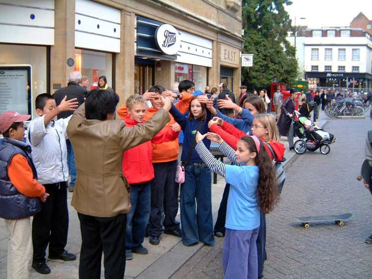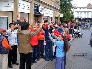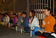 江XX的车队未到酒店之前,法轮功学员们普遍安静地在音乐声中打坐、发正念;“迎江”队的中国学生曾通过高音喇叭唱“伟大的祖国”“学习雷锋好榜样”。许多“迎江”队的学生见到法轮功学员队伍中有许多西方人士,面露惊讶表情,有人不由喊出:“快看!还有老外!”