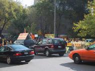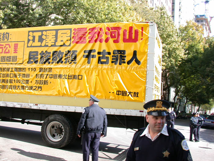 在江XX从酒店后门进入酒店后,一辆箱形卡车出现在酒店及附近,缓缓行驶,为迎江队伍带来一片寂静。车头上方写着大型“江卖国”字样并配有一张江搂抱叶利钦的图片。车身四周张挂着大型黄色布幅,上面用红黑蓝三色大字写着“江泽民,还我河山!民族败类,千古罪人”“344万平方公里国土正式纳入俄国版图”“千古罪人,罪责难逃!”等字样。据一位芝城居民介绍,这辆箱形卡车自10月19日起,便开始在中国城来回行驶。