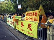 理兹酒店的正门外,五百名法轮功学员列队打坐、立掌发正念,空中飘逸的只有中国古典风格的乐曲“普度”;酒店东侧(侧门)处有两百多名学员静坐抗议,姿态严肃而祥和;酒店正对面的公园内,大树上悬挂的法轮大法横幅鲜艳夺目,几十名法轮功学员席地而坐,表情平和。侧门外,警察安排的是中领馆雇来的“迎江”队伍。稍后西藏及台湾团队赶到现场呐喊示威。