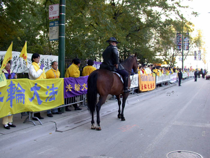 此次江XX在芝加哥逗留期间计划住在理兹-卡尔顿酒店(Ritz Carlton)。从奥亥尔军用机场到理兹大酒店沿途有五六百名法轮功学员打着许多写有“法轮大法好”、“停止镇压”、“真善忍”字样的大中小型中英文横幅。据现场传来的消息,有值勤警察曾上前询问沿途抗议的法轮功学员会做什么,答曰“要打横幅”,警察安心地首肯了学员的做法。