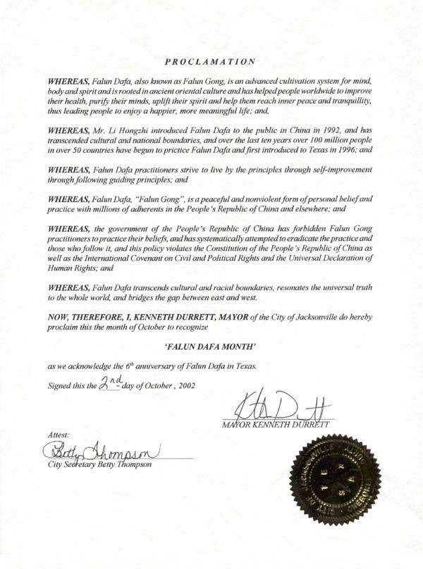 鉴于,李洪志先生于1992年在中国将法轮大法传播于世,他已跨越了文化与国家的界限,在过去十年中,有五十多个国家的一亿多人开始修炼法轮大法,并且于1996年首次传入德克萨斯州;并且