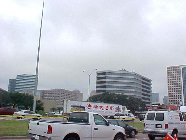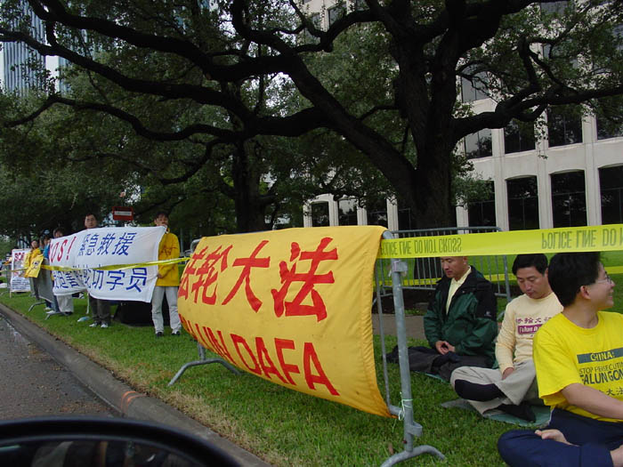 【明慧网2002年10月24日】10月23号上午,500余名法轮功学员在江XX即将进入的休士顿洲际酒店四周沿路集体抗议,学员们的黄色上衣和打出的横幅随处可见。