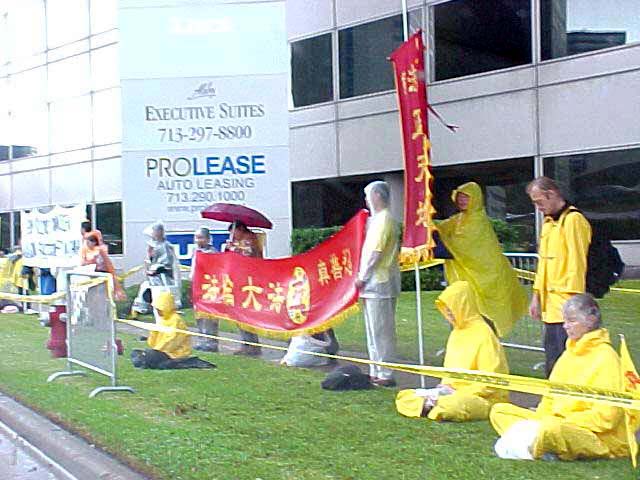 图片报道:法轮功学员在江氏所在的休士顿洲际酒店周围抗议